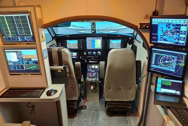 It should be noted that the course is common for pilots and operators of the onboard system, in terms of theory. The practical part is conducted in this console simulator for the evaluation of the Air Navigation System (ANS) with a flight simulator, in which the positions of the evaluating pilot and the operator of the onboard system are identified separately, just as they are in reality. This is made possible because the simulator consists of an aircraft cockpit and a console operator station. However, it is possible to conduct the simulation individually and separately for the pilot and the operator.